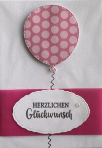 Geburtstagskarte mit Rosa Balon mit Punkten, Rosa Streifen, weißer Umschlag