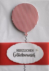 Geburtstagskarte mit Rot gestreiftem Balon, Oranger Banderole, weiße Karte, weißer Umschlag