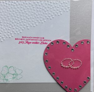 Großformatkarte 15×15 mit weißem Umschlag, Herz mit Glitzersteinen, Ringen, Kleedruck